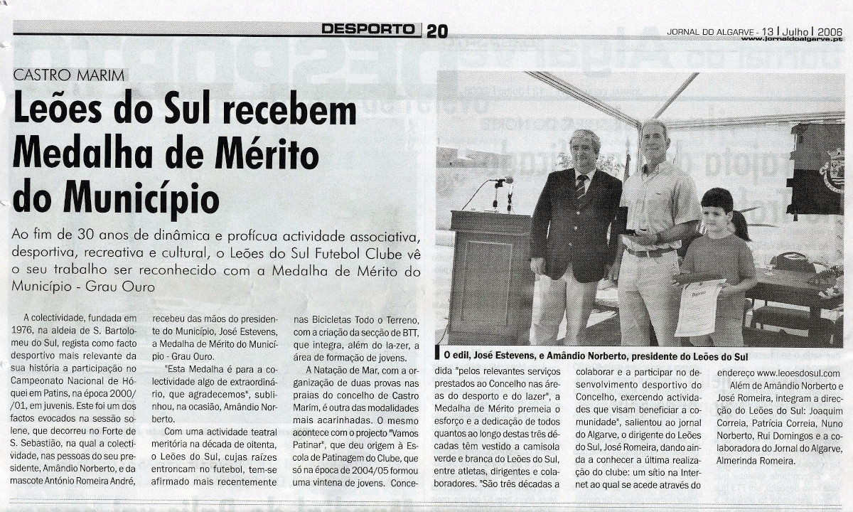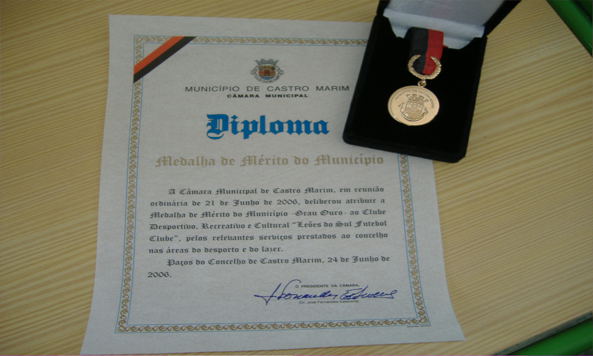 A Câmara Municipal de Castro Marim, em reunião ordinária de 21 de Junho de 2006, deliberou atribuir a Medalha de Mérito do Município – Grau Ouro – ao Grupo Desportivo, Recreativo e Cultural “Leões do Sul Futebol Clube”, pelos relevantes serviços prestados ao concelho nas áreas do desporto e do lazer.